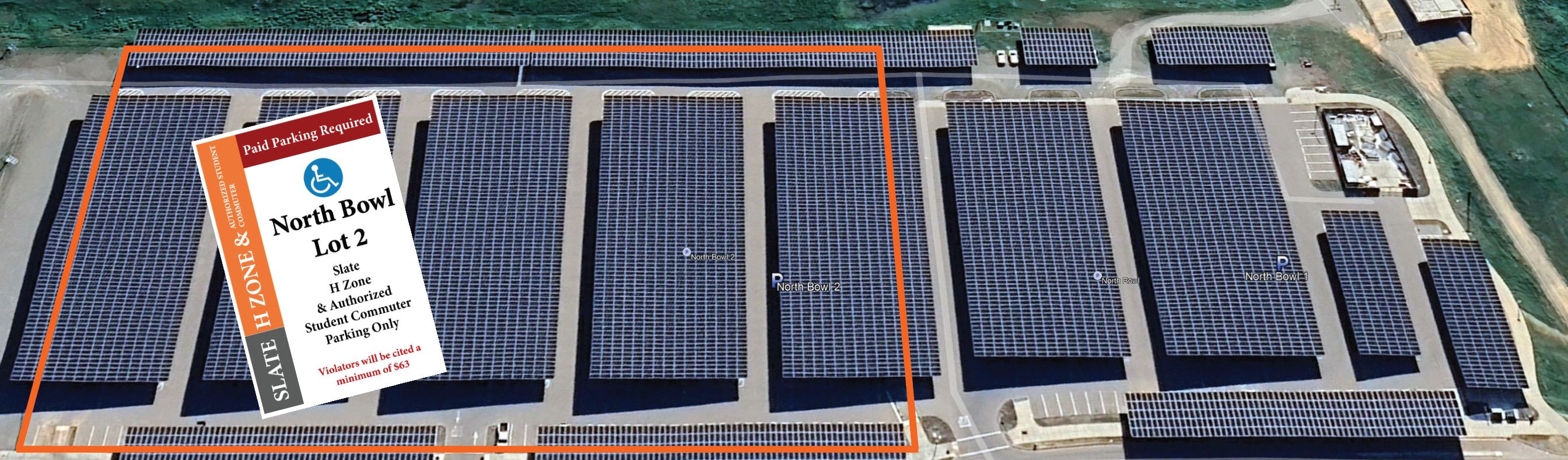 Student commuters are eligible to purchase monthly North Bowl 2 parking. Permits can be purchased at the TAPS office. The permit cost is $50 per month. This permit is only valid in North Bowl 2 - H Zone & Authorized Commuter Students.